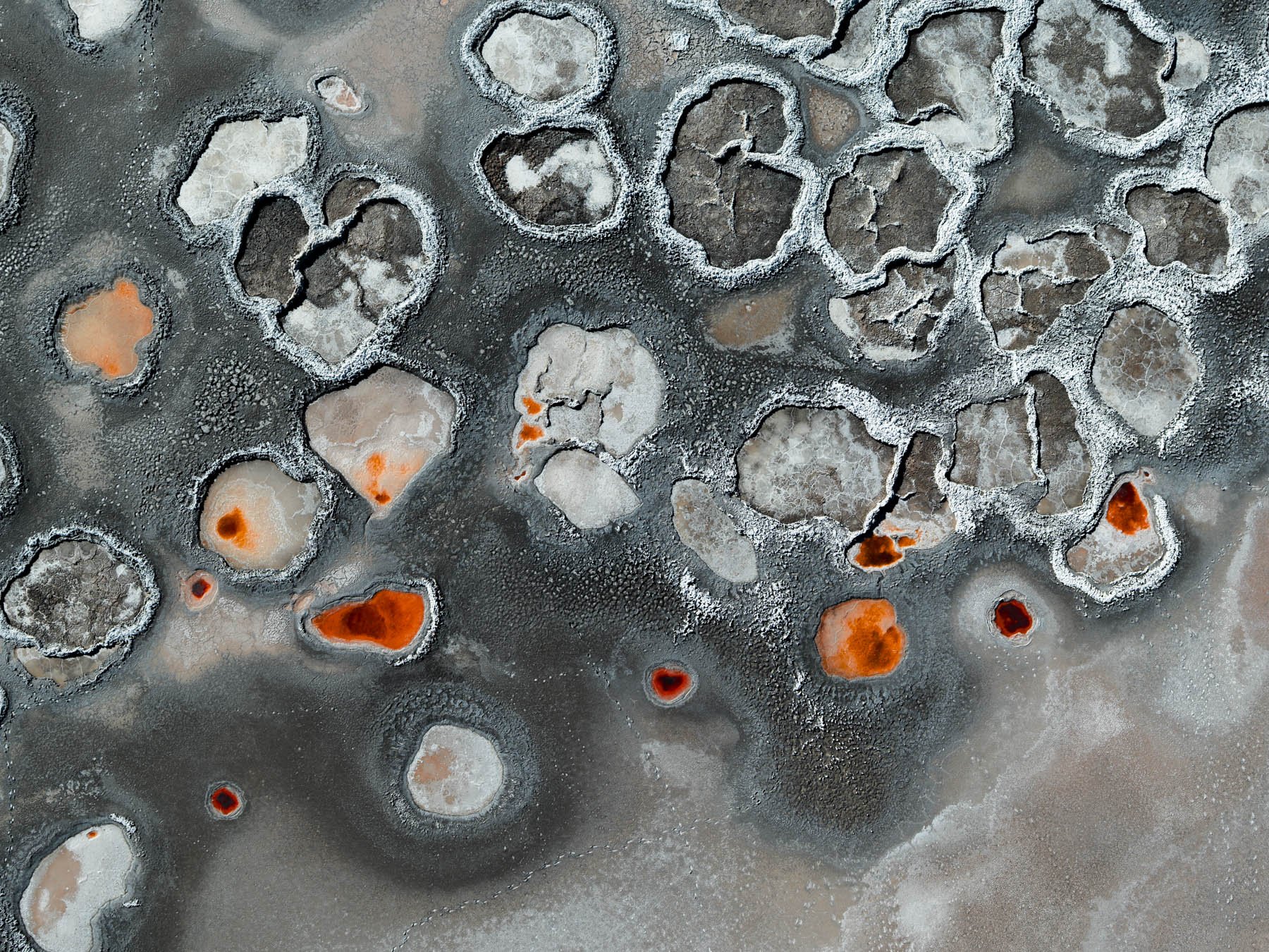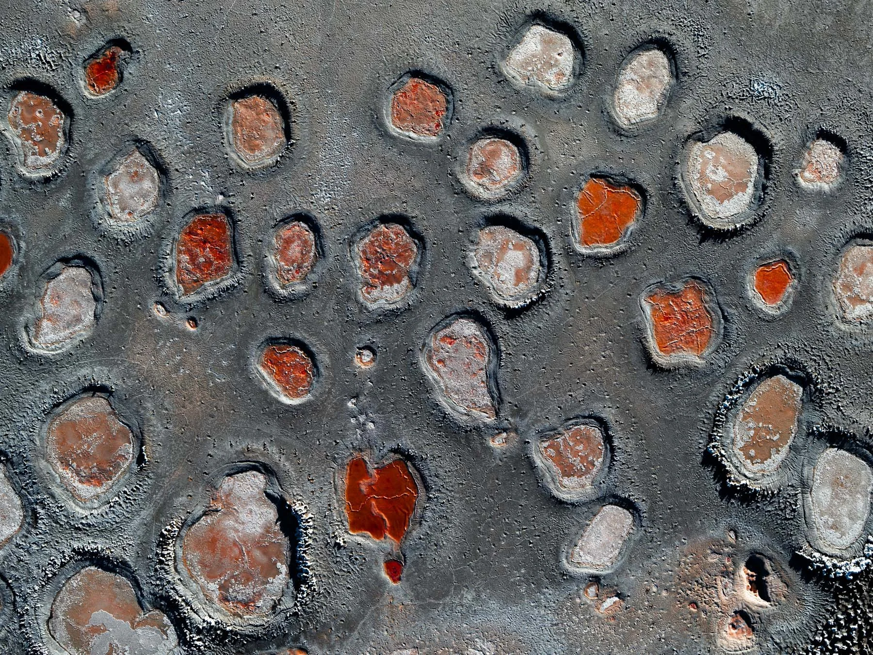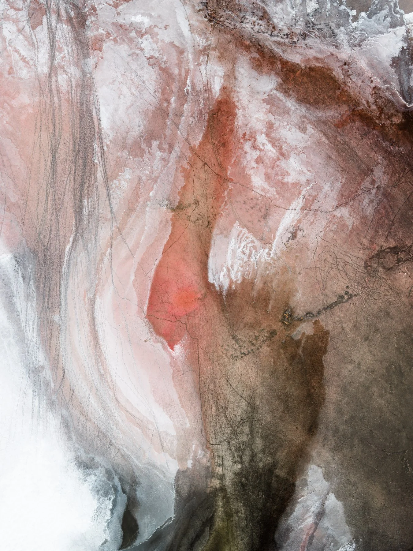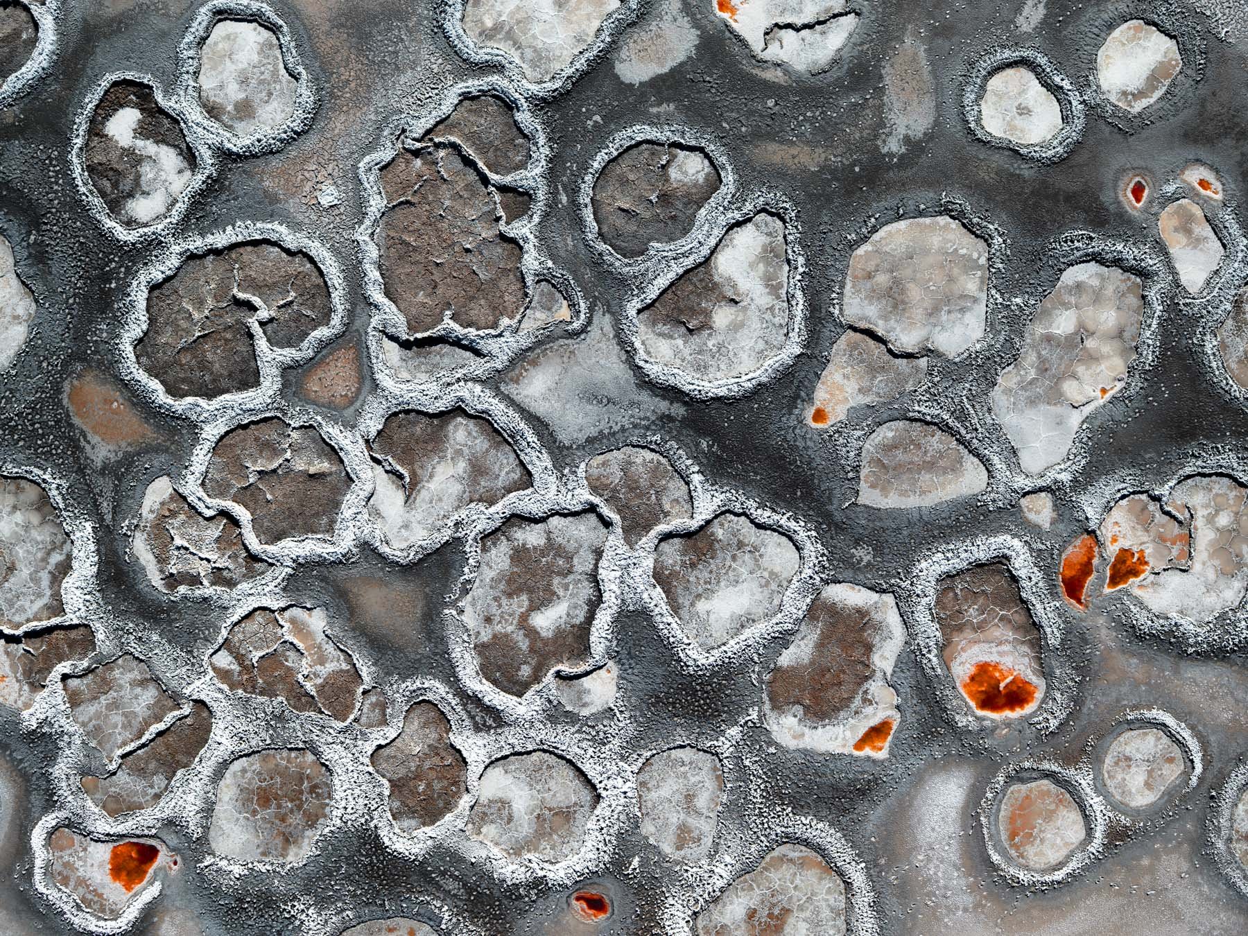 These colors are produced by microscopic life—halophilic microorganisms and algae - that thrive in hypersaline conditions and develop pigments to protect themselves from ultraviolet radiation. As the water evaporates, intricate salt patterns, polygonal crusts, and crystalline textures emerge, creating striking natural abstractions.