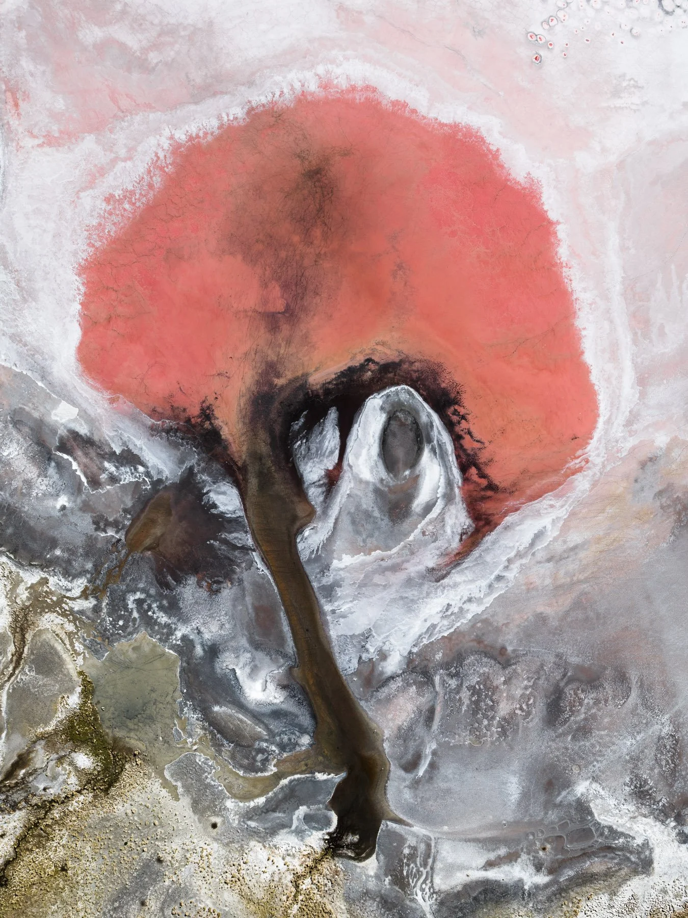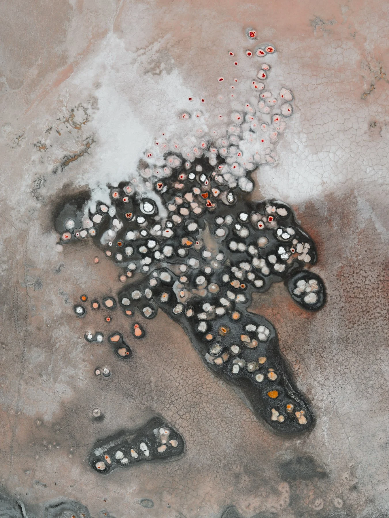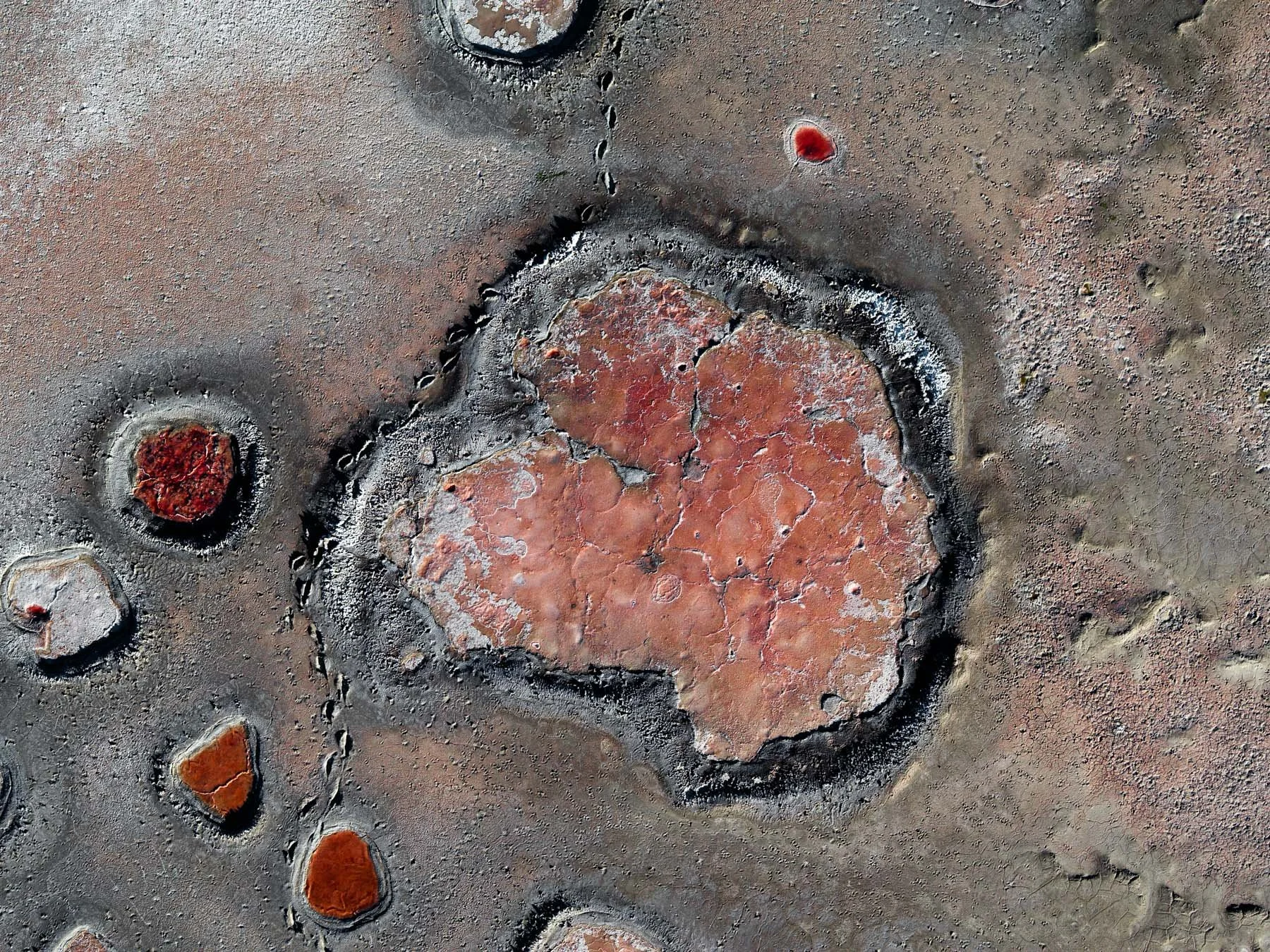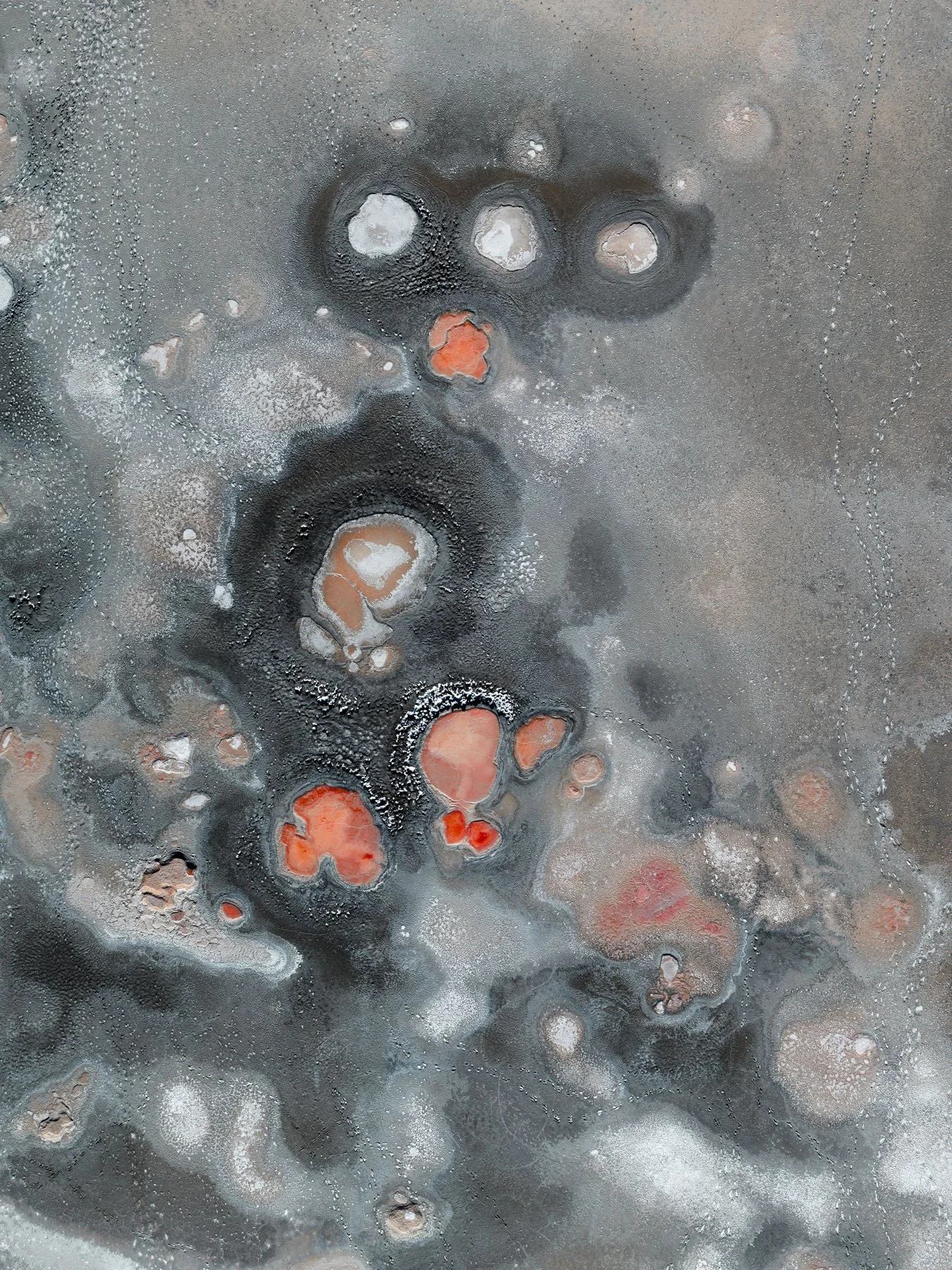 These colors are produced by microscopic life—halophilic microorganisms and algae - that thrive in hypersaline conditions and develop pigments to protect themselves from ultraviolet radiation. As the water evaporates, intricate salt patterns, polygonal crusts, and crystalline textures emerge, creating striking natural abstractions.