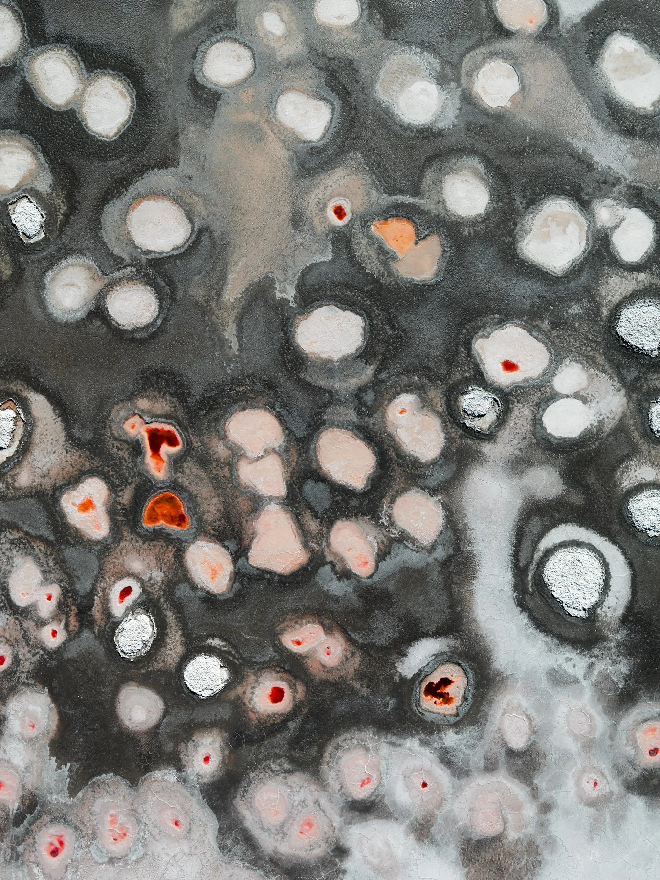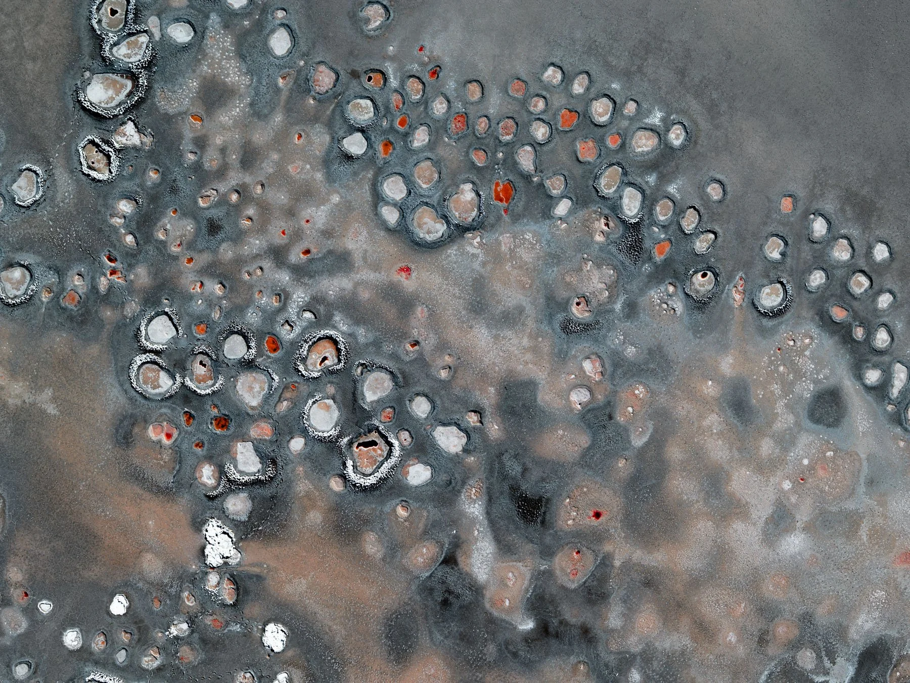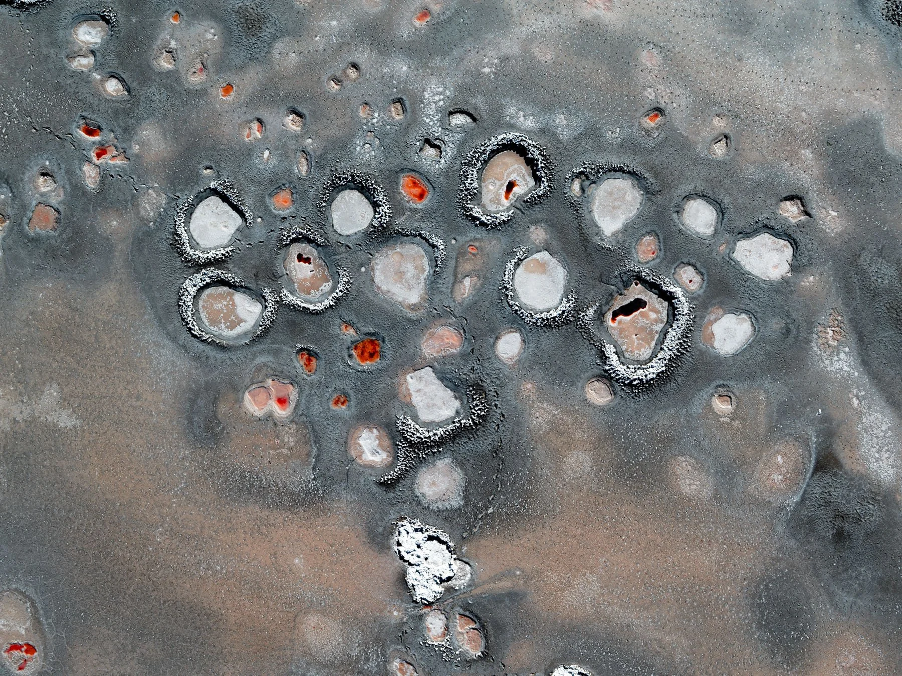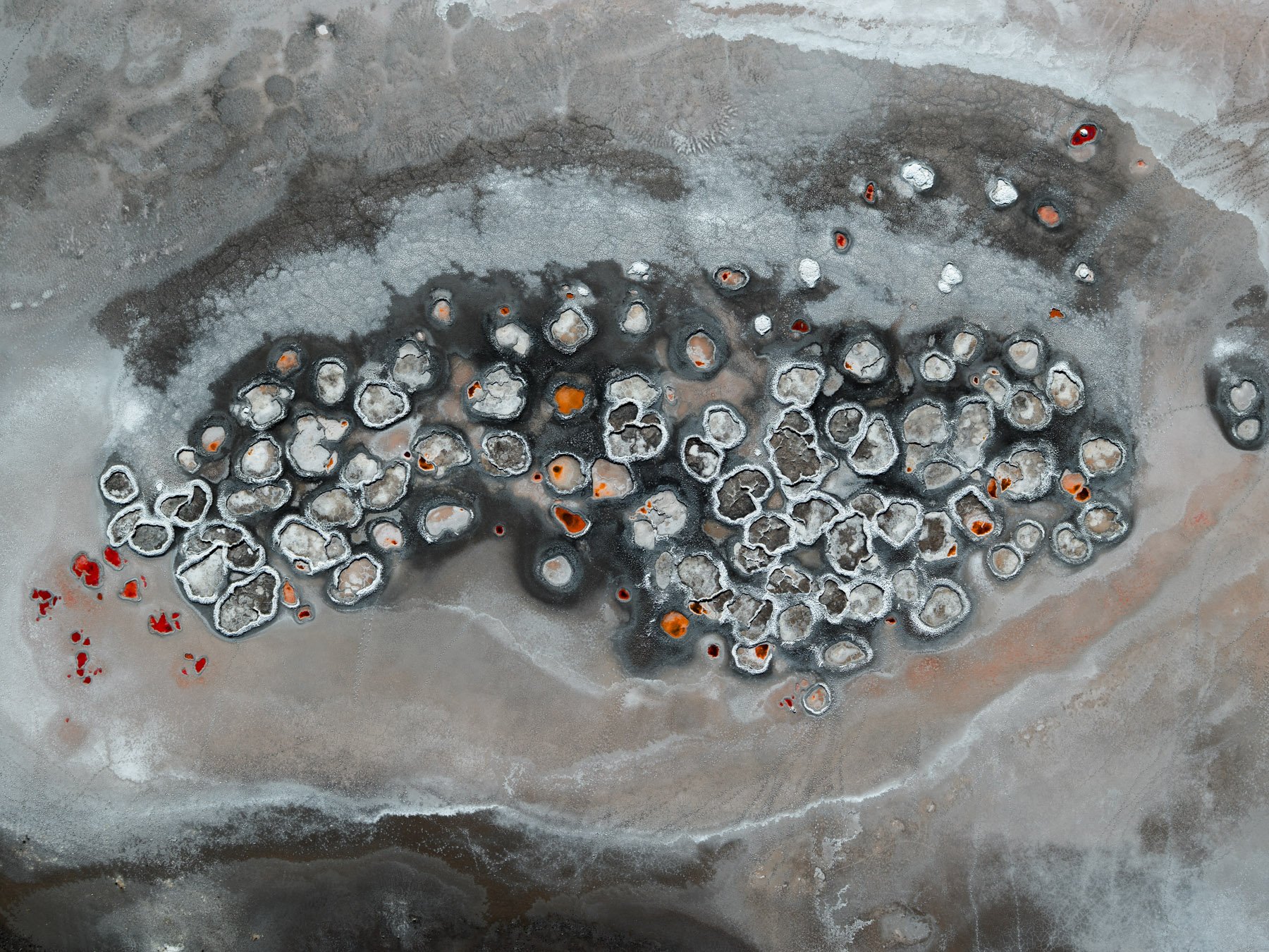 These colors are produced by microscopic life—halophilic microorganisms and algae - that thrive in hypersaline conditions and develop pigments to protect themselves from ultraviolet radiation. As the water evaporates, intricate salt patterns, polygonal crusts, and crystalline textures emerge, creating striking natural abstractions.