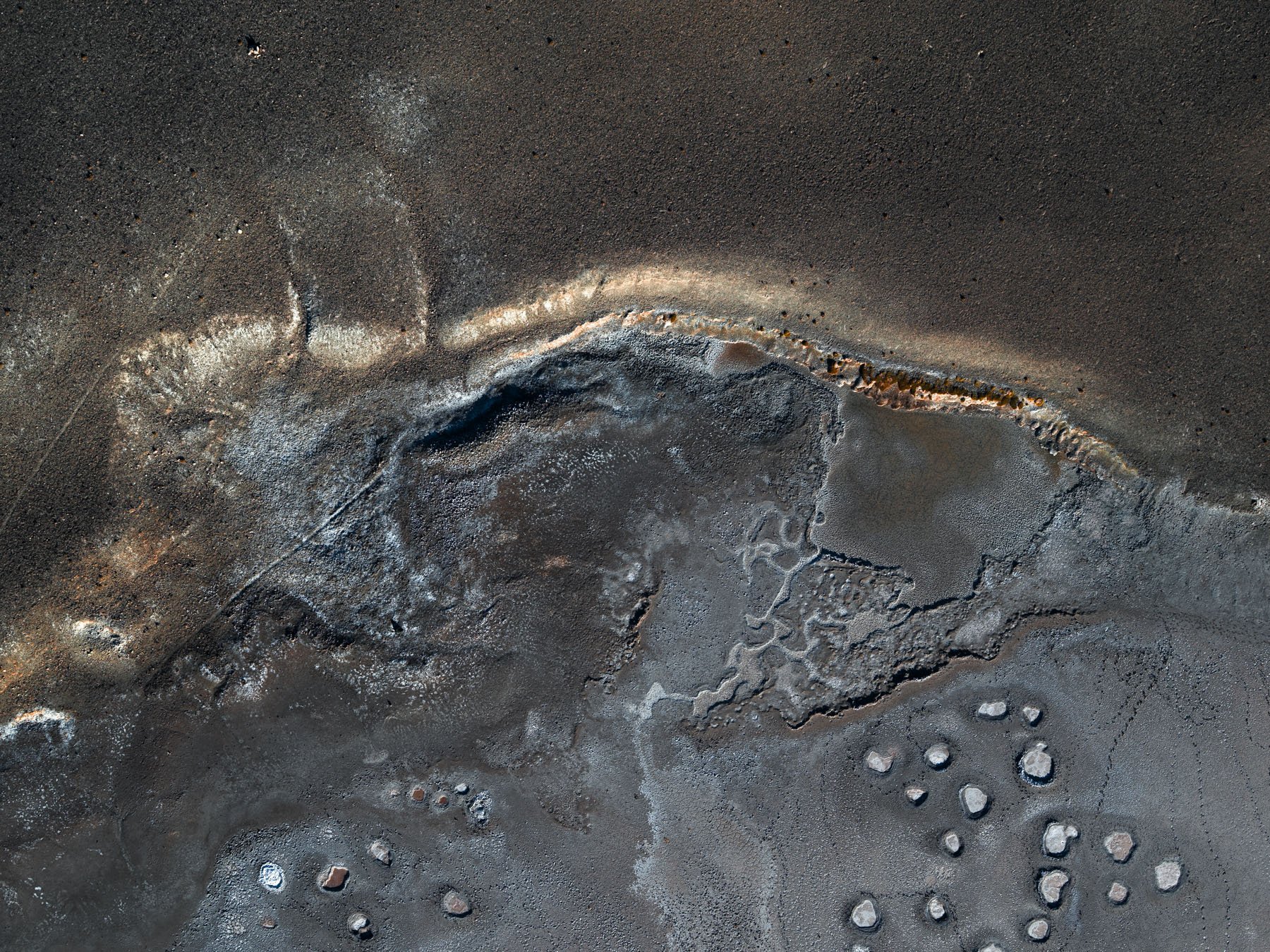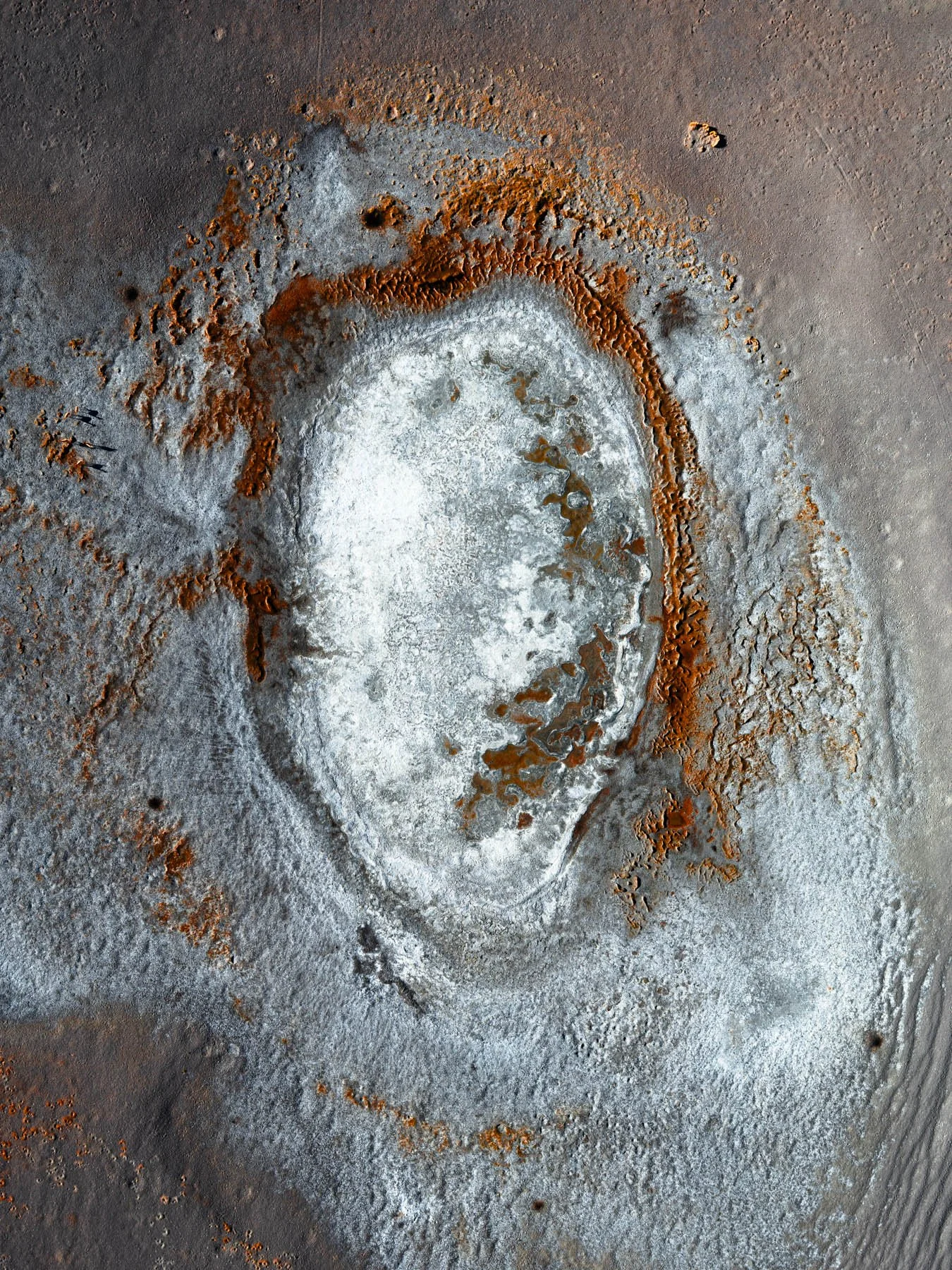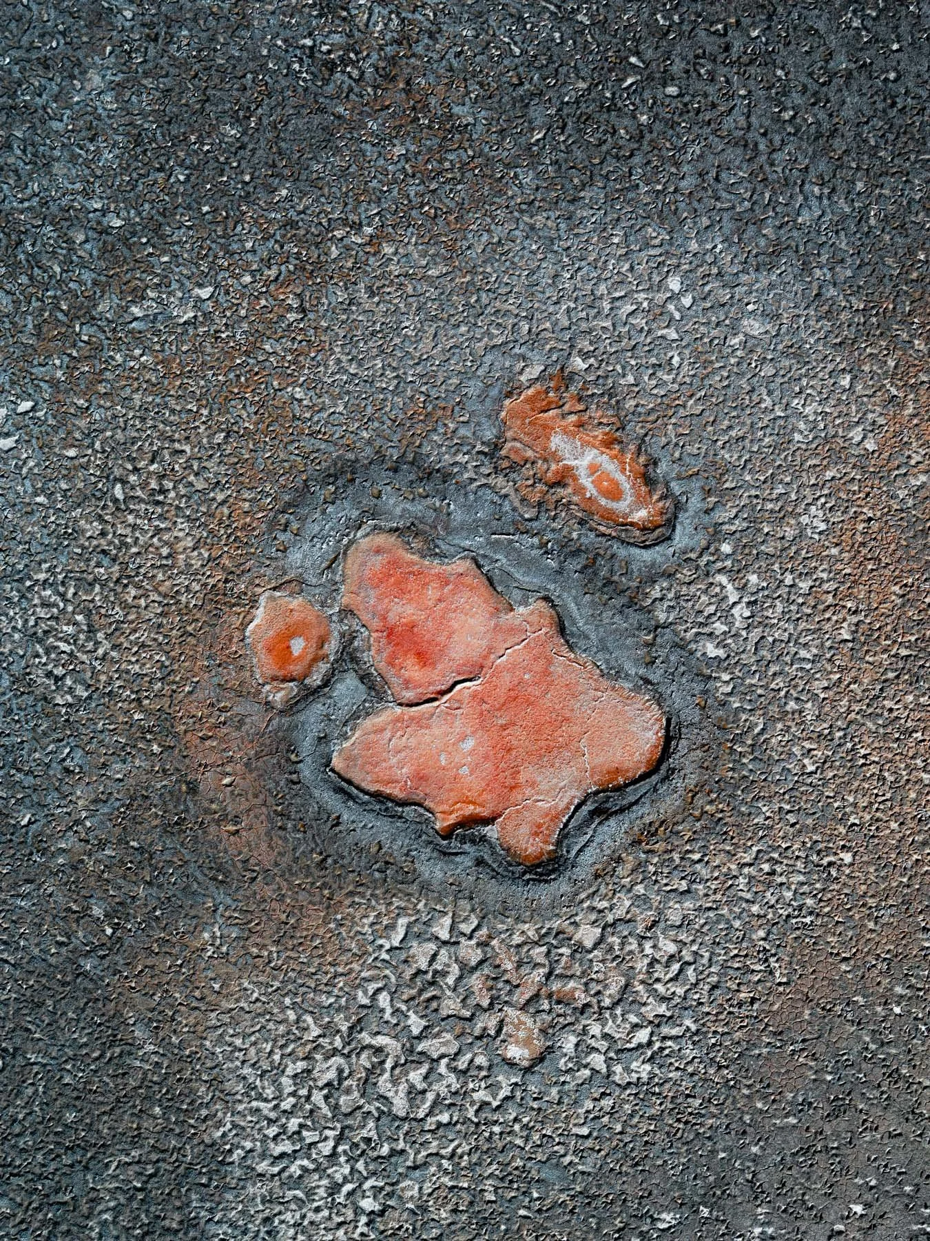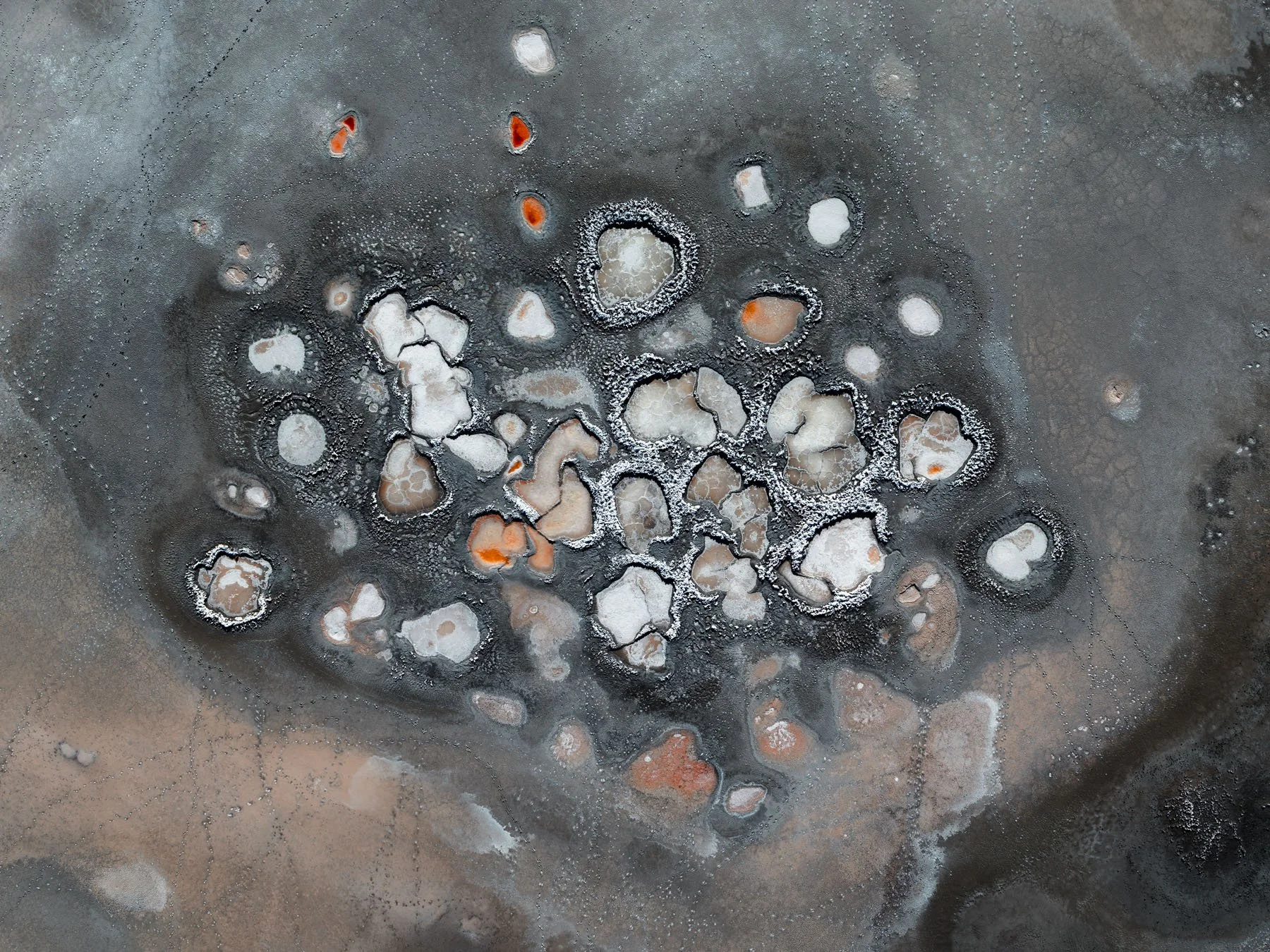 These colors are produced by microscopic life—halophilic microorganisms and algae - that thrive in hypersaline conditions and develop pigments to protect themselves from ultraviolet radiation. As the water evaporates, intricate salt patterns, polygonal crusts, and crystalline textures emerge, creating striking natural abstractions.
